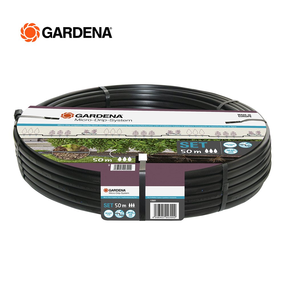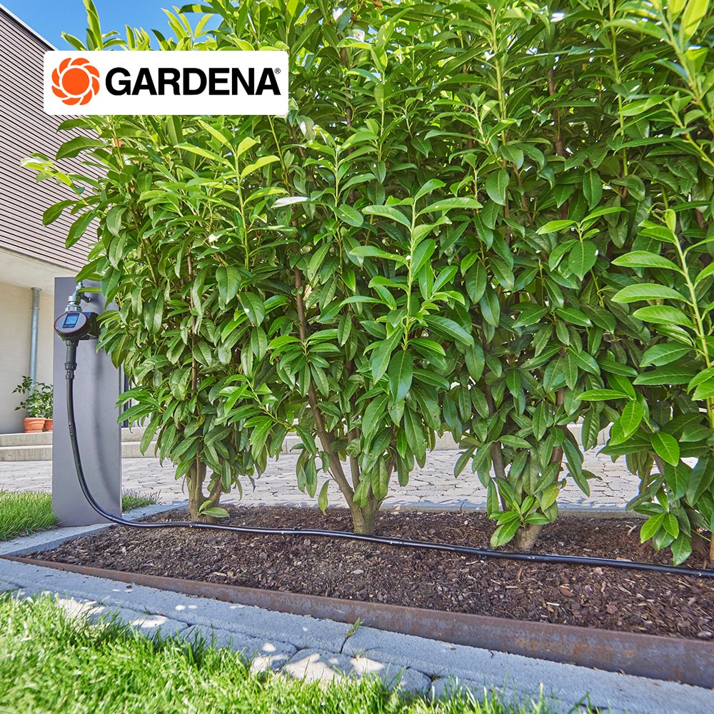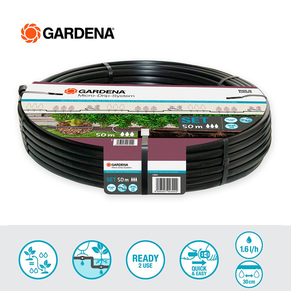 Use the Micro-Drip-Irrigation Hedge/Bush Set (50 m) by GARDENA for water-saving and reliable irrigation of your hedges, bushes, shrubs or front garden plants. The Ready-2-Use set contains all the components you need to set it up. You can quickly install it in just a few well-explained steps. First, you connect the water hose to the Master Unit 1000 for even pressure. Then you connect the 50 m long Drip Irrigation Line to the Master Unit and lead it to the plants. If it is underground, the clever labyrinth technology with root barrier ensures that the pipe does not become blocked. A pressure-compensating Drip Head is integrated in the pipe every 30 cm. Even with height differences, the Drip Heads constantly provide 1.6 litres of water per hour to your hedge, so that it is irrigated evenly. With the separately available 13 mm connectors with patented Quick & Easy connection technology, you always have the option of flexibly expanding and converting the Micro-Drip-System. The MDS components are not damaged and you can reuse them as often as you like for long-term use. For example, add more Drip Irrigation Lines or a GARDENA Water Control to the set for convenient, automatic and time-saving irrigation. Micro-Drip-System. Caring for your plants and every precious drop. Easy, accurate, water and time-saving irrigation.