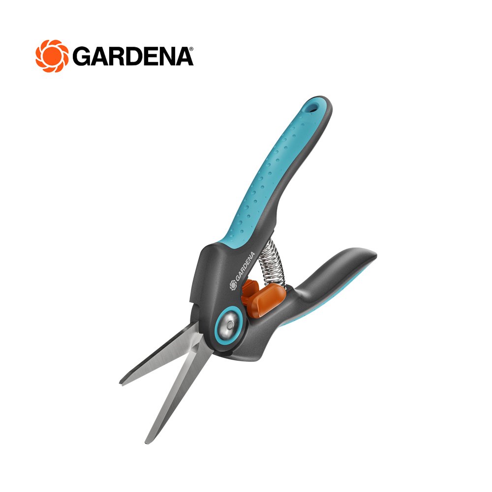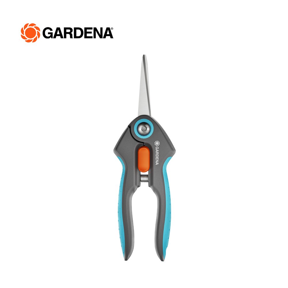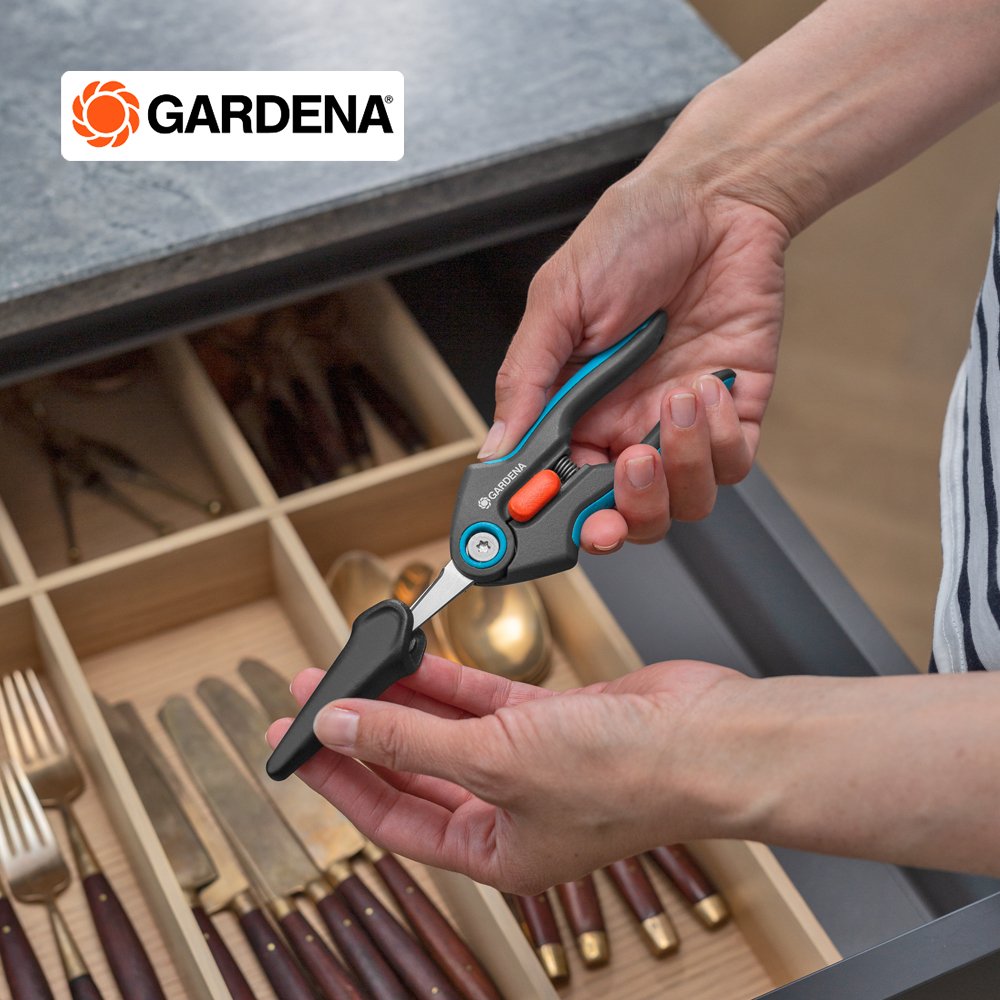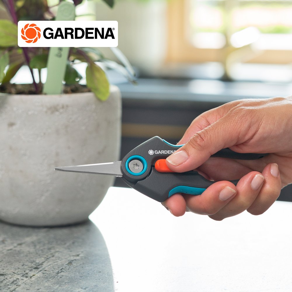 The FreshCut from GARDENA is particularly suitable for harvesting fresh herbs, berries or cut flowers. The narrow, pointed precision blades made of rustproof and durable stainless steel will impress you with every snip. With the help of the FreshCut, you will succeed in making clean and precise cuts right to the tip. The harvesting scissors also master tight spots, so you can harvest basil or deadhead flowers with ease. The scissors lie comfortably and securely in your hand thanks to the non-slip ErgoTec handles with soft grip. For safe storage and transport, put the included safety cap over the closed blades. The one-hand locking mechanism lets you simply unlock the scissors and lock them tightly. No matter what you're cutting, the food-safe blades don't give off any taste or smell. For easy cleaning, the shears are dishwasher safe. GARDENA Micro-Cutting. Give your harvest the respect it deserves with our range of precise tools.