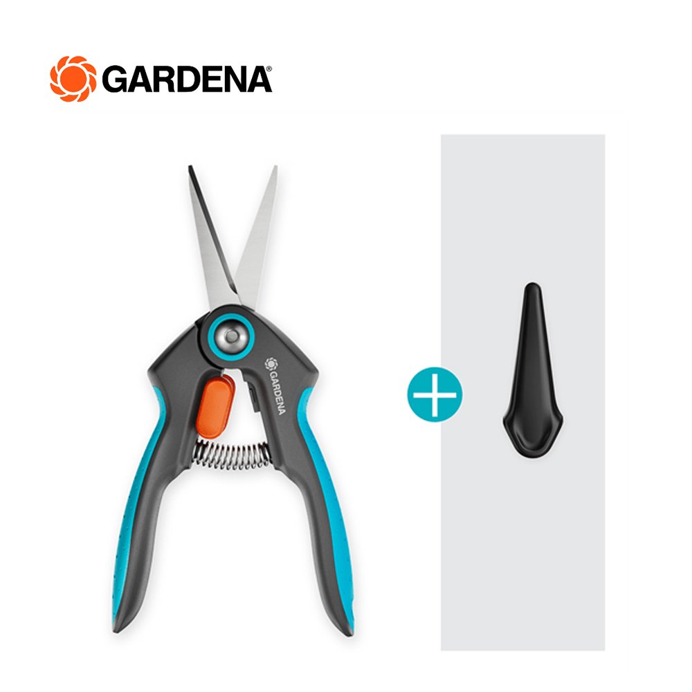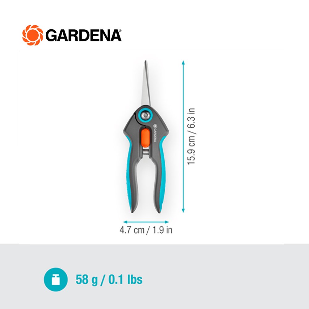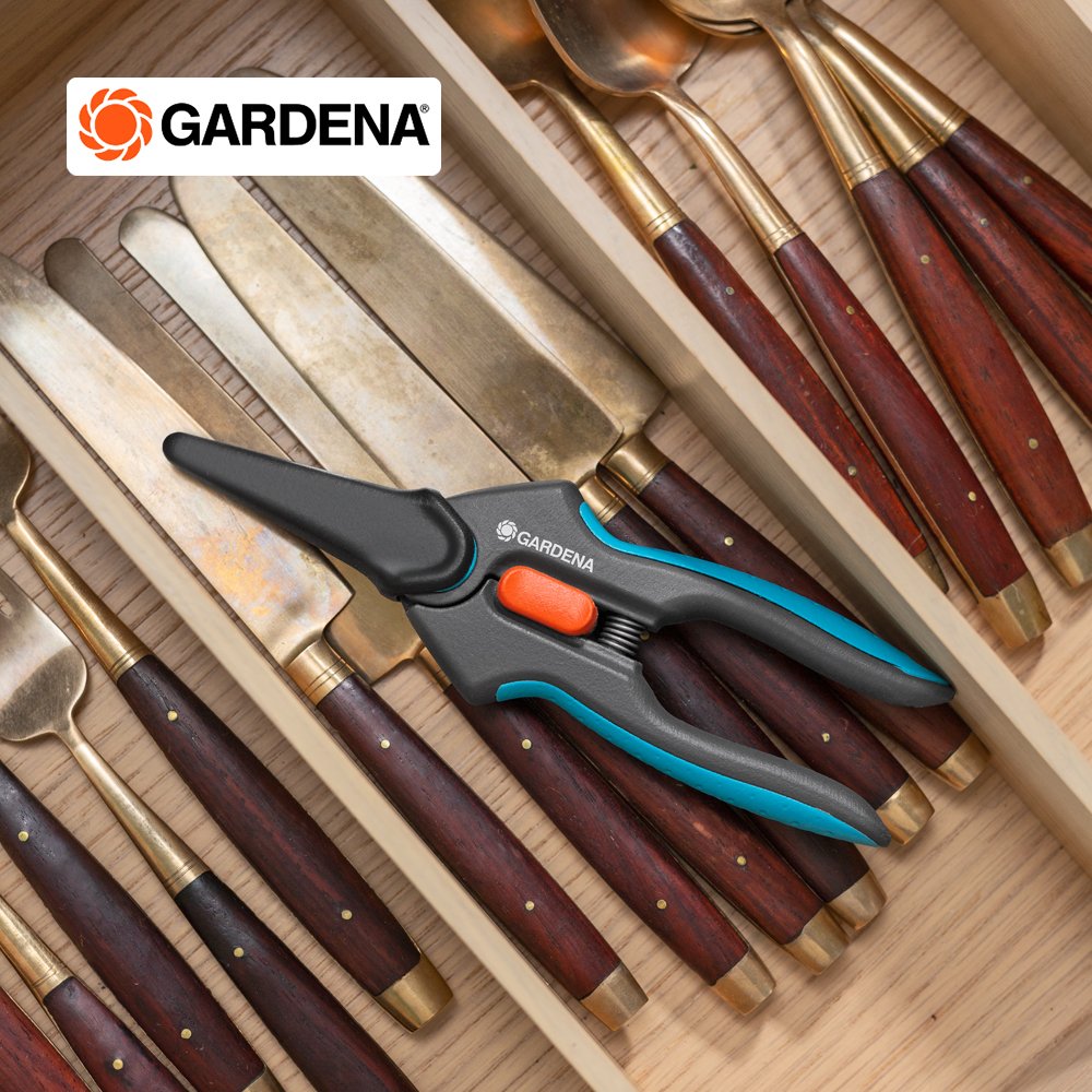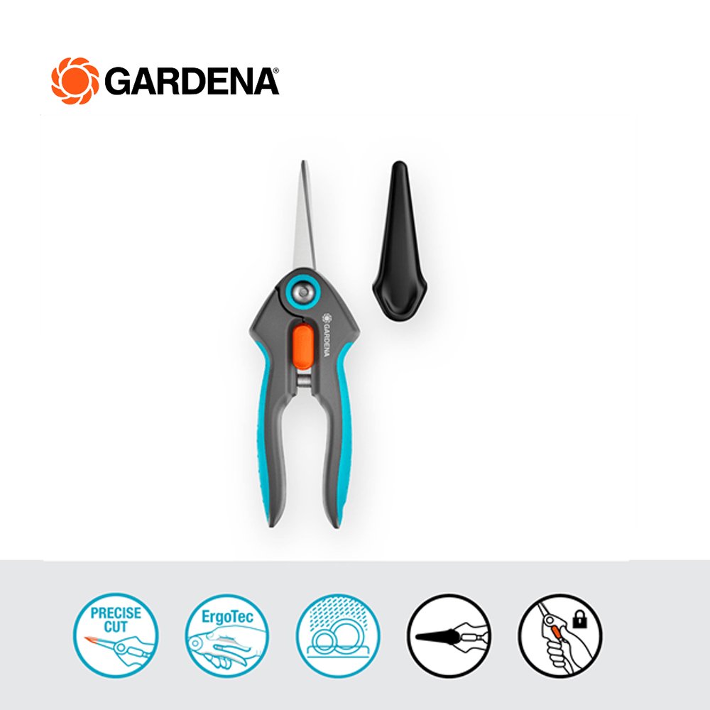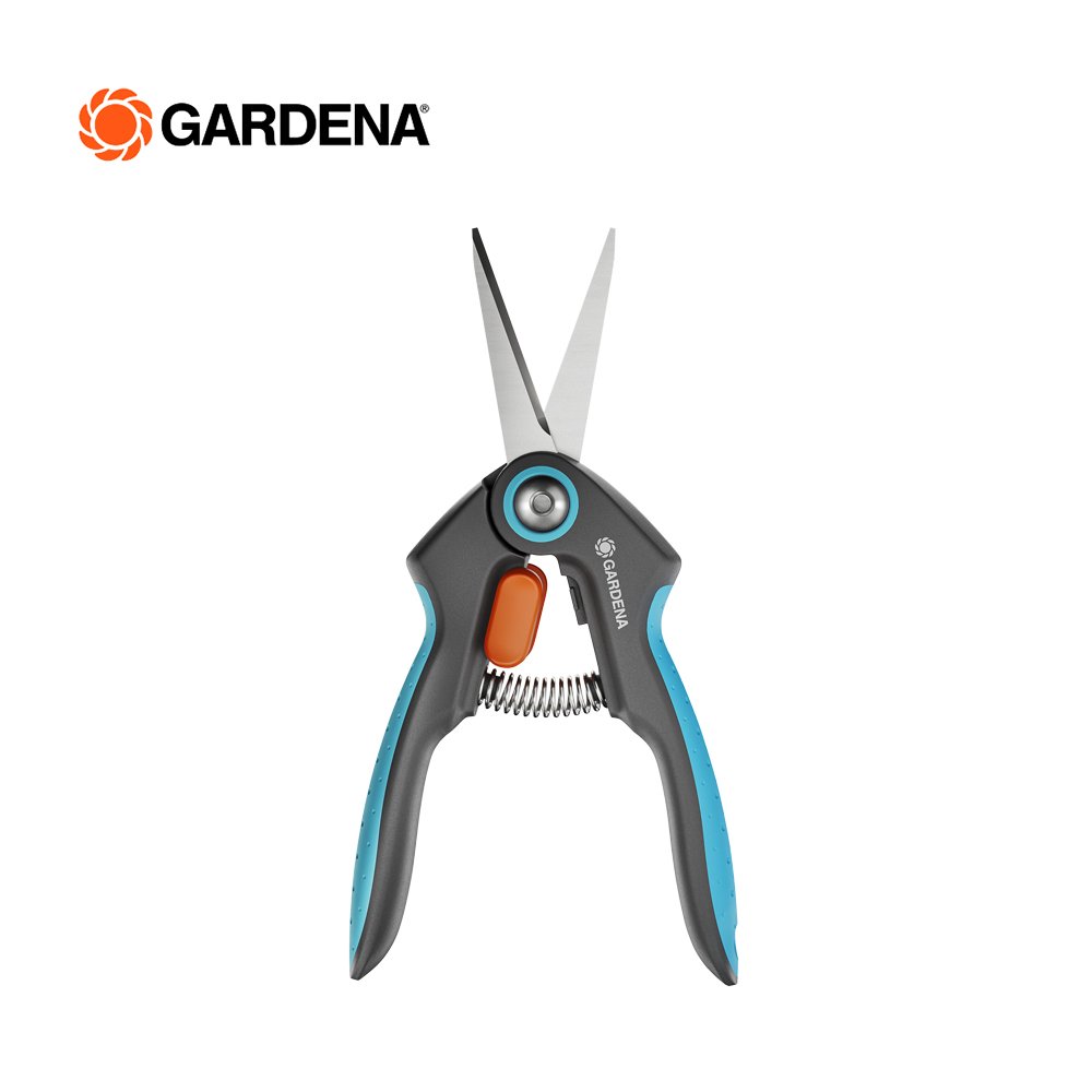 The FreshCut from GARDENA is particularly suitable for harvesting fresh herbs, berries or cut flowers. The narrow, pointed precision blades made of rustproof and durable stainless steel will impress you with every snip. With the help of the FreshCut, you will succeed in making clean and precise cuts right to the tip. The harvesting scissors also master tight spots, so you can harvest basil or deadhead flowers with ease. The scissors lie comfortably and securely in your hand thanks to the non-slip ErgoTec handles with soft grip. For safe storage and transport, put the included safety cap over the closed blades. The one-hand locking mechanism lets you simply unlock the scissors and lock them tightly. No matter what you're cutting, the food-safe blades don't give off any taste or smell. For easy cleaning, the shears are dishwasher safe. GARDENA Micro-Cutting. Give your harvest the respect it deserves with our range of precise tools.