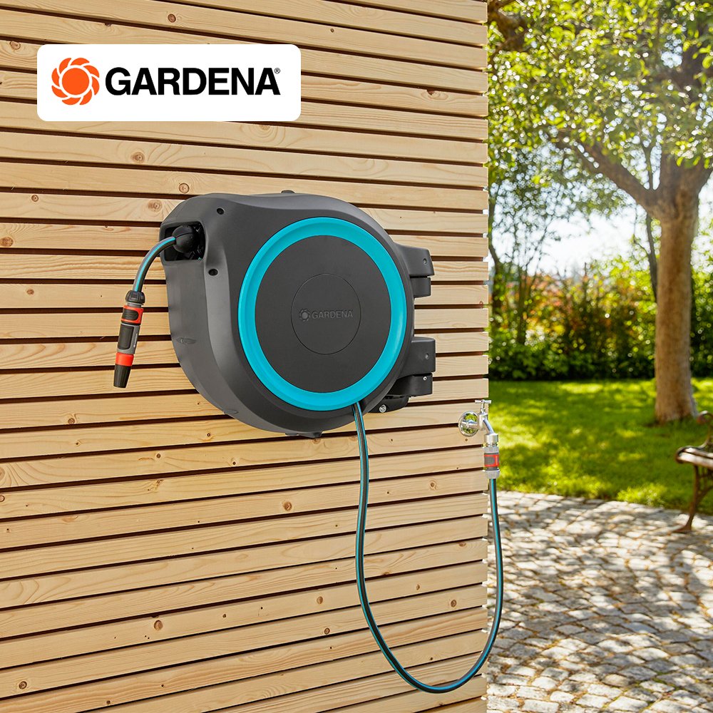 The Wall-Mounted Hose Box RollUp XL makes watering a large garden pleasant and simple. You attach the compact hose storage permanently on your house wall and connect it to the tap with a connecting hose. Thanks to the 35-metre-long hose and the 180° swivel hose box, watering your plants is a pleasure and not a chore. The hose reel follows your direction of movement and prevents the hose from kinking or knotting. After you have pulled out the hose to the desired length for watering, the particularly short locking points automatically grip and fix the hose as soon as you stop. By pulling the end of the hose lightly, the locking mechanism is released and an integrated steel spring winds up the extended garden hose fully automatically, reliably and evenly for you. Thanks to the innovative RollControl technology, the retraction is particularly safe and controlled. The integrated hose guide ensures that the hose is rolled up neatly and evenly, without getting tangled. The tap and hose connections of the hose box are part of the Original GARDENA System, so you can attach other GARDENA Watering Attachments at any time. You will always have your GARDENA nozzles to hand: they can be attached underneath the wall bracket and stored there to save space. The high-quality material is UV and frost proof, protected from weather damage, and can therefore be used all year round. In addition, the hose storage is secured with an anti-theft device. All necessary connection and assembly parts are included with the Wall-Mounted Hose Box RollUp: a wall bracket, a connecting hose, all necessary Original GARDENA System Parts and a nozzle with two different spray jet options. GARDENA gives a five-year warranty on the high-quality hose storage. Watering that's always ready for action—with the GARDENA Wall-Mounted Hose Box RollUp XL.