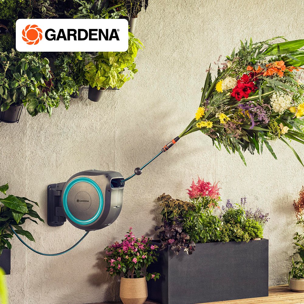 Ready for immediate use The Wall-Mounted Hose Box RollUp XL comes with a wall bracket, a 35-metre irrigation hose, a connecting hose, all required Original GARDENA System Parts and a nozzle with two different spray jet options.