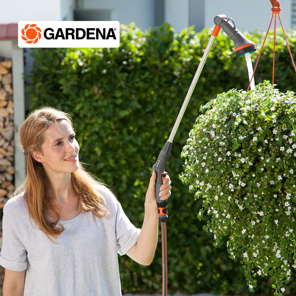 Gardena Comfort Hanging Basket Spray Lance, Hanging baskets and plants in remote positions can be watered paticularly easely and accurately using the GARDENA Comfort Hanging Basket Spray Lance. If the water flow is to be continuous, you can lock the pulse trigger. Tiring of the hand is thereby prevented.The hanger attachment allows quick and easy storage after use.