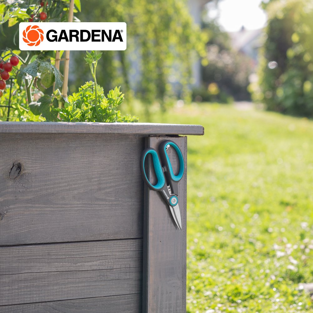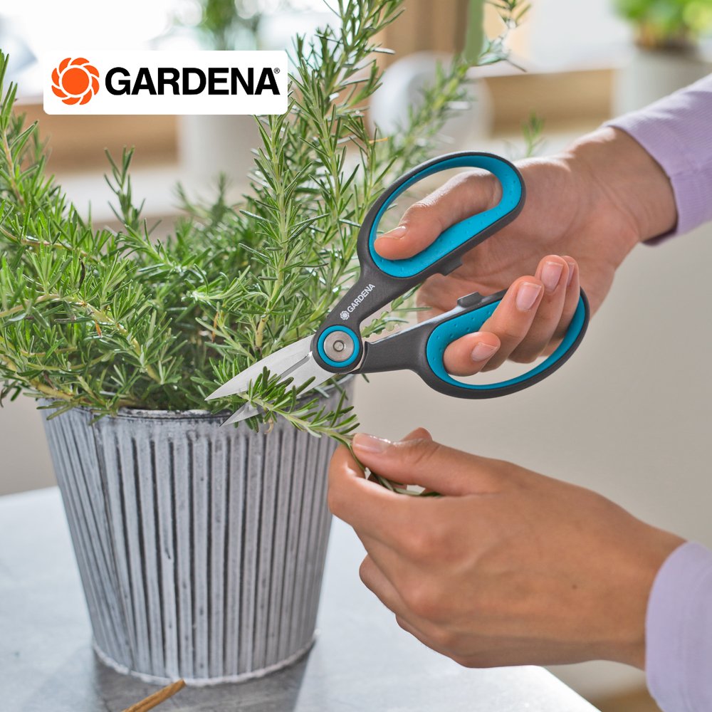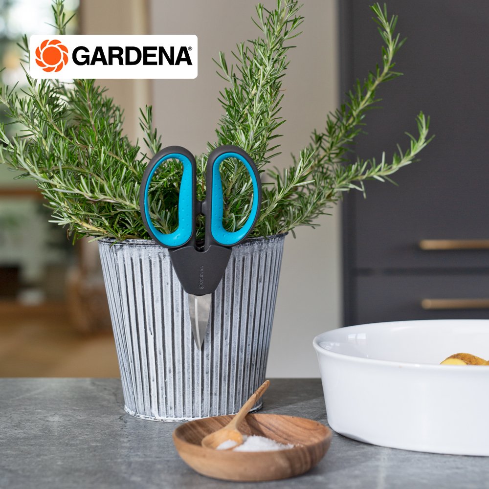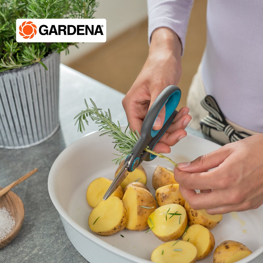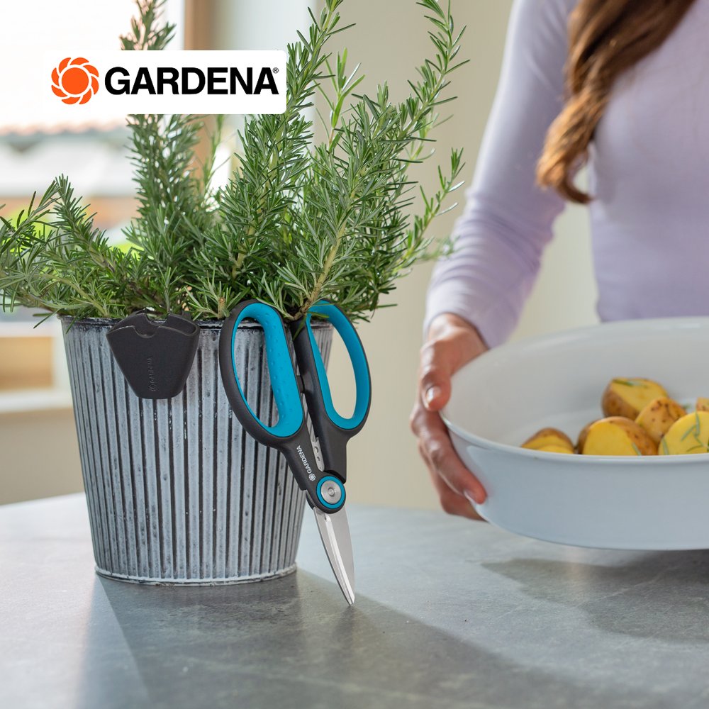 Gardena กรรไกรเอนกประสงค์ปลายแหลม คุณสามารถตัดสมุนไพรที่เป็นเนื้อไม้ เช่น โรสแมรี่ ไธม์ ได้อย่างน่าเชื่อถือ ในชุดใช้งานจริงพร้อมซองใส่ กรรไกรพร้อมใช้งานทันที ใบมีดปลายแหลมทำจากสแตนเลสที่ทนทานและปราศจากสนิมช่วยให้คุณตัดได้อย่างแม่นยำยาวนาน ระหว่างที่จับทั้ง 2 ข้างมีรูขนาดต่างกัน 3 รู ซึ่งมีฟังก์ชันการกำจัดใบไม้ได้จริง เช่น ดึงก้านโรสแมรี่ผ่านก้านโรสแมรี่แล้วดึงใบทั้งหมดในคราวเดียว จากนั้นคุณสามารถใช้สมุนไพรปรุงอาหารโดยตรงหรือตากให้แห้งก็ได้ กรรไกรตัดสมุนไพรทั้งผู้ถนัดขวาและซ้าย พอดีมือคุณได้อย่างสบายเสมอด้วยด้ามจับ ErgoTec ที่ออกแบบตามหลักสรีระศาสตร์ ด้ามจับกันลื่นพร้อมด้ามจับแบบนุ่มช่วยให้จับได้อย่างมั่นคงตลอดเวลา กรรไกรเอนกประสงค์ ด้ามจับและซองหนังทำจากพลาสติกรีไซเคิลมากกว่า 70 % หากต้องการเก็บกรรไกรเพียงใส่ไว้ในซองติดไว้กับกระถางสมุนไพรได้เลย ใบมีดเหมาะสำหรับการสัมผัสอาหาร กลิ่นหรือรสชาติจะไม่หลุดออกด้วยกรรไกรที่ปลอดภัยต่ออาหาร นอกจากนี้ยังทำความสะอาดง่ายและปลอดภัยกับเครื่องล้างจานอีกด้วย