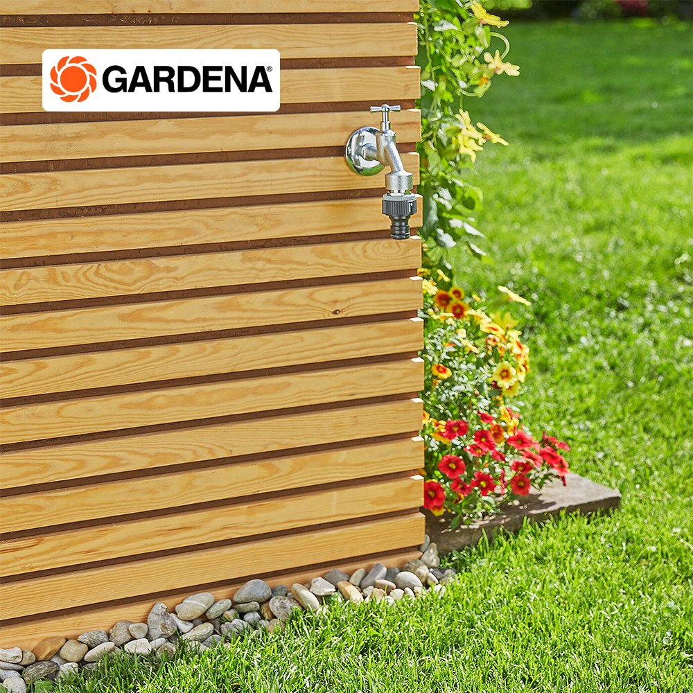 Gardena ข้อต่อสำหรับก๊อกน้ำ ขนาด 3/4'' (26.5 มม.) เหมาะอย่างยิ่งเมื่อใช้ร่วมกับสายยางหรือปั๊มที่ยาวขึ้น เพียงแค่สวมข้อต่อเข้ากับก๊อก